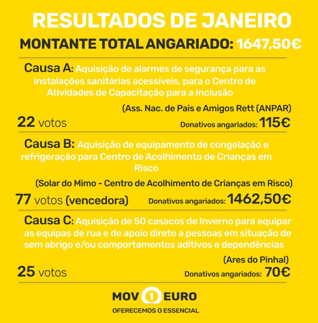 Em janeiro, recebemos em donativos extra 337€, que se distribuíram pelas causas (Causa A – 115€; Causa B – 152€; Causa C – 70€). Para a causa vencedora, Causa B, adicionámos, ao valor dos donativos extra, o valor dos nossos Embaixadores da Mudança. Sendo assim, após o fecho da campanha, angariamos: